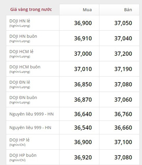 Giá vàng tại Hà Nội ở mức 36,9 - 37,05 triệu đồng/ lượng (mua vào- bán ra), trong khi giá vàng tại TP.HCM ở mức cao hơn là 37 - 37,2 triệu đồng/ lượng (mua vào - bán ra).