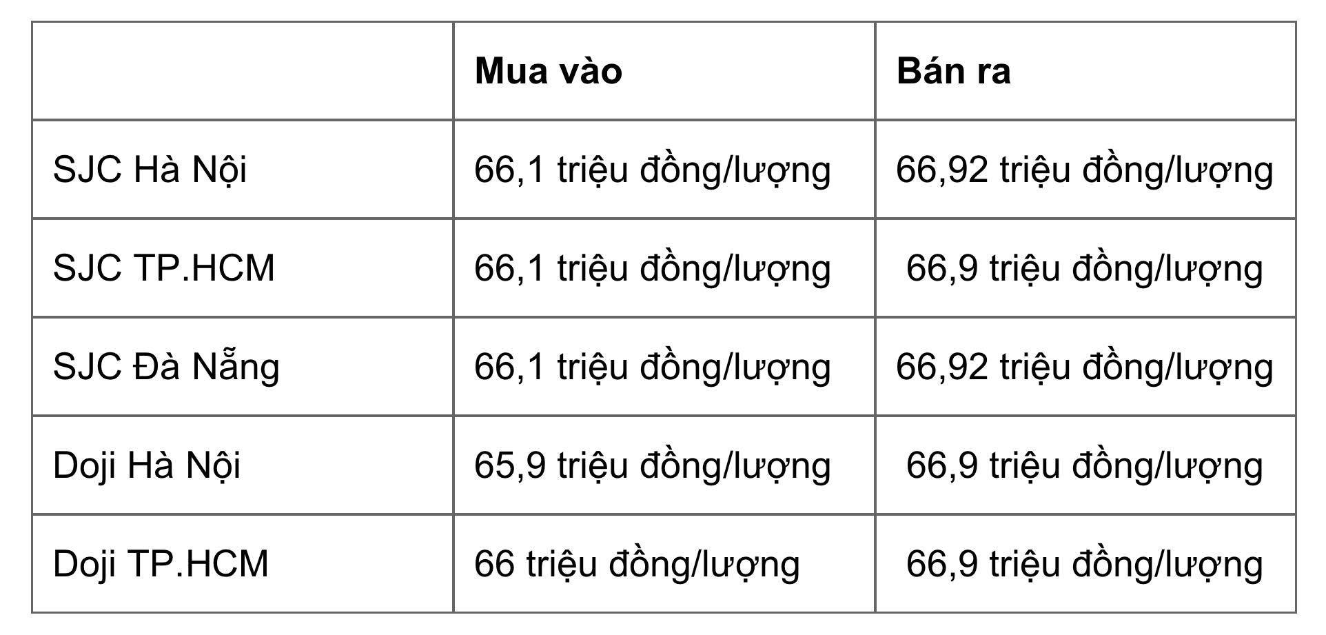 Chốt phiên hôm nay, giá vàng miếng của SJC tăng 100 nghìn đồng/lượng so với kết phiên hôm qua. Hôm nay, giá vàng miếng của Doji tại Hà Nội giảm 100 nghìn đồng/lượng ở chiều bán nhưng lại tăng 200 nghìn đồng/lượng ở chiều mua, giá vàng miếng của Doji tại TP.HCM giảm 200 nghìn đồng/lượng ở chiều bán và tăng 200 nghìn đồng/lượng ở chiều mua so với hôm qua.