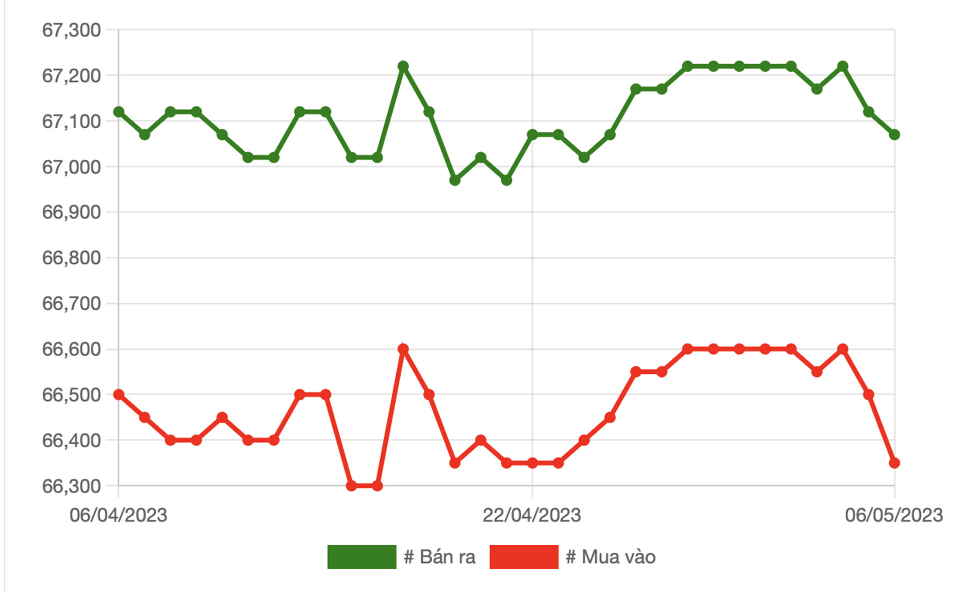 Chốt phiên giao dịch 6/5, giá vàng miếng 9999 tại SJC TP.HCM là 66,35 triệu đồng/lượng (mua vào) và 67,05 triệu đồng/lượng (bán ra). SJC Hà Nội niêm yết ở mức 66,35 triệu đồng/lượng (mua vào) và 67,07 triệu đồng/lượng (bán ra).