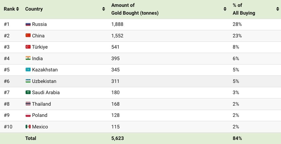 Phần lớn các nước mua vàng nhiều nhất đều là các nền kinh tế mới nổi. Các quốc gia này dự trữ vàng để phòng ngừa rủi ro tài chính và địa chính trị, ảnh hưởng đến tiền tệ, đặc biệt là tỷ giá với USD.
