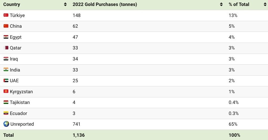 Tuy nhiên, khoảng 2/3 tương đương với 741 tấn vàng đã không được báo cáo chính thức. Theo các nhà phân tích, các giao dịch mua vàng không được báo cáo có thể đến từ các quốc gia như Trung Quốc và Nga.