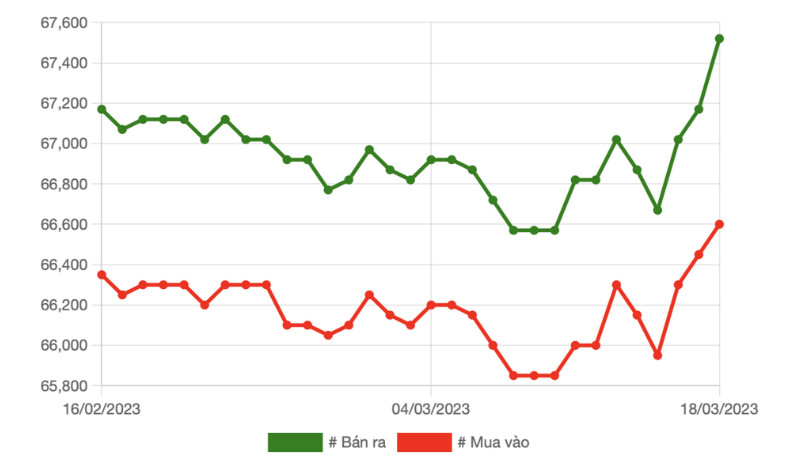 Chốt phiên giao dịch 18/3, giá vàng miếng 9999 tại SJC TP.HCM là 66,6 triệu đồng/lượng (mua vào) – 67,5 triệu đồng/lượng (bán ra). SJC Hà Nội niêm yết ở mức 66,6 triệu đồng/lượng (mua vào) và 67,52 triệu đồng/lượng (bán ra).