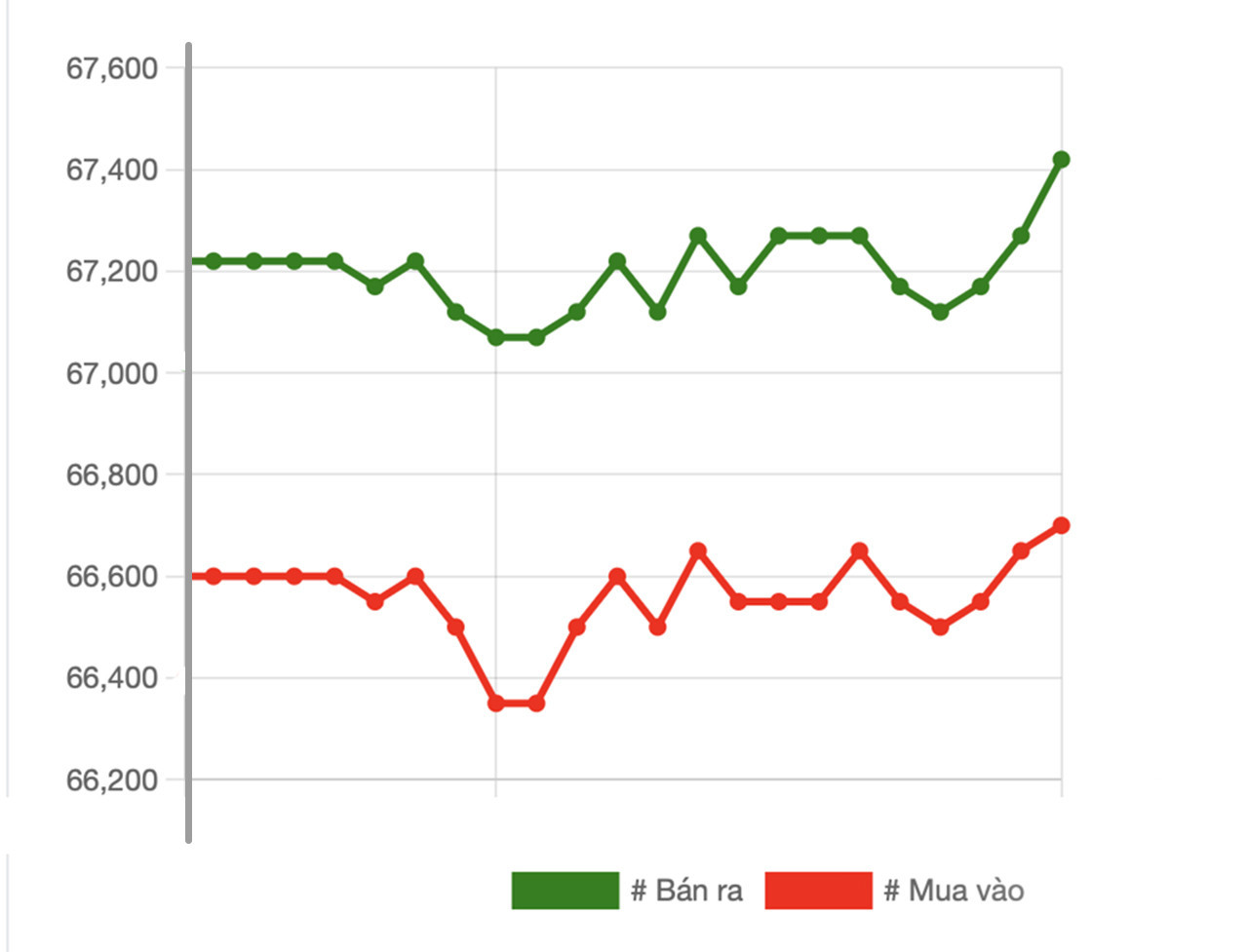 Chốt phiên giao dịch 20/5, giá vàng miếng 9999 tại SJC TP.HCM là 66,7 triệu đồng/lượng (mua vào) và 67,4 triệu đồng/lượng (bán ra). SJC Hà Nội niêm yết ở mức 66,7 triệu đồng/lượng (mua vào) và 67,42 triệu đồng/lượng (bán ra).