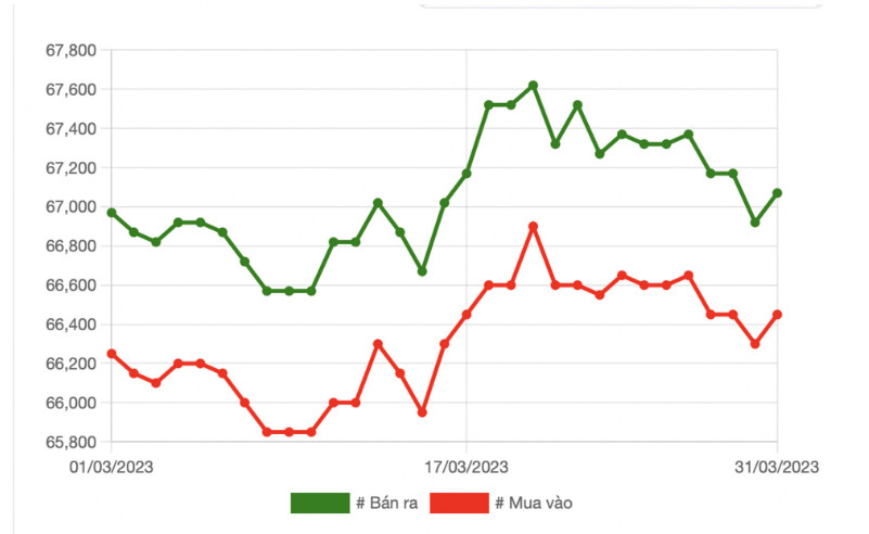 Từ phiên 16 đến 20/3, giá vàng trong nước tăng mạnh. Ngày 20/3, SJC niêm yết giá vàng miếng 9999 là 66,9 triệu đồng/lượng (mua vào) – 67,62 triệu đồng/lượng (bán ra). Doji niêm yết ở mức 66,8 triệu đồng/lượng (mua vào) và 67,5 triệu đồng/lượng (bán ra). Đây là mức giá cao nhất trong tháng 3.