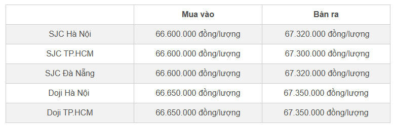 Trong khi giá vàng miếng của Tập đoàn Vàng bạc đá quý Doji tại Hà Nội không đổi; giá vàng miếng của Doji tại TP.HCM giảm 200 nghìn đồng/lượng ở cả chiều mua vào và bán ra so với chốt phiên chiều qua.
