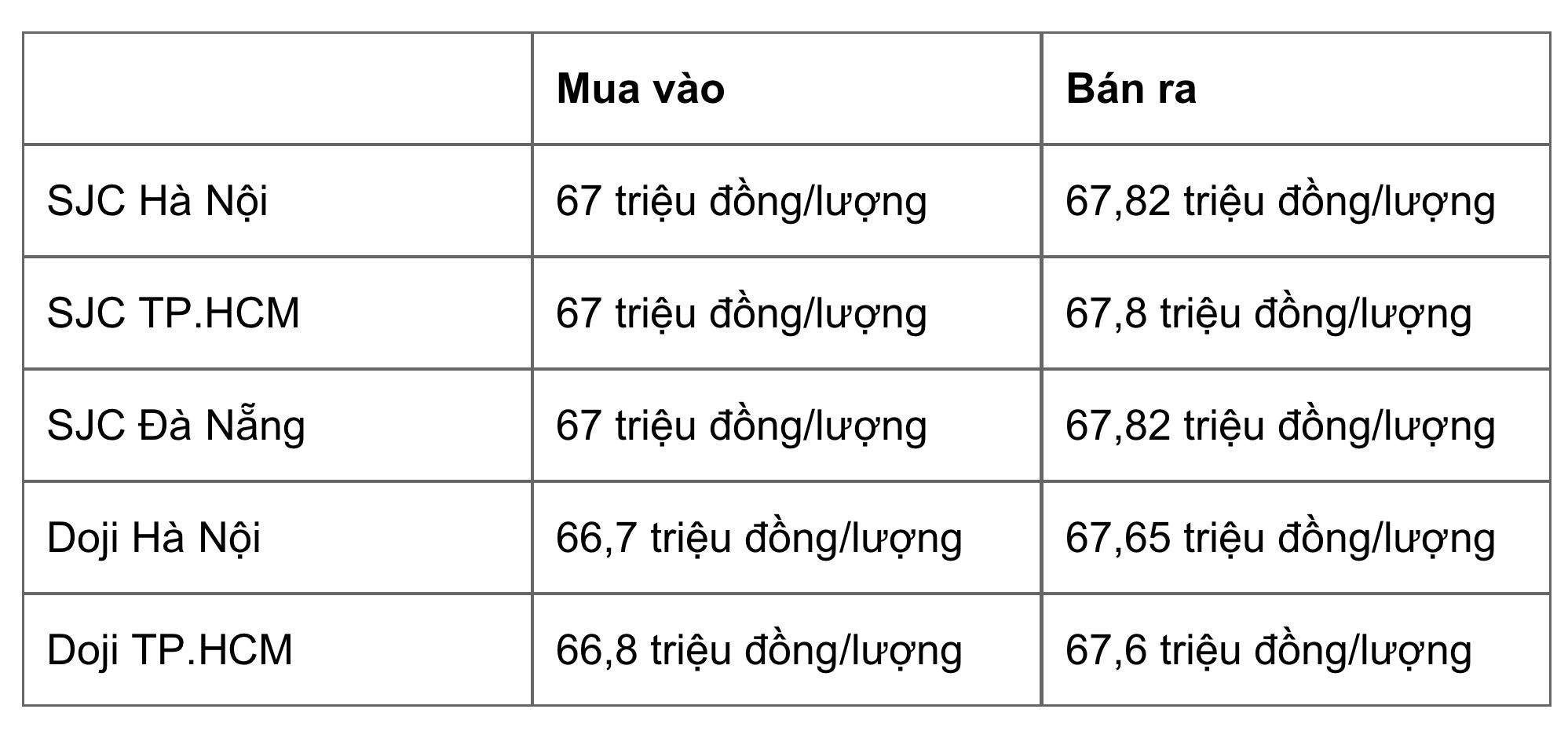 Chốt phiên hôm nay, giá vàng miếng của SJC tăng 400 nghìn đồng/lượng ở cả chiều mua vào và bán ra so với kết phiên hôm qua. Giá vàng miếng của Doji tại Hà Nội tăng 300 nghìn đồng/lượng ở chiều mua và tăng 350 nghìn đồng/lượng ở chiều bán; giá vàng miếng của Doji tại TP.HCM tăng 400 nghìn đồng/lượng ở chiều mua và tăng 300 nghìn đồng/lượng ở chiều bán so với chốt phiên hôm qua.