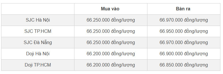Trong khi đó, sáng nay, giá vàng miếng của Tập đoàn Vàng bạc đá quý Doji tại Hà Nội tăng 150 nghìn đồng/lượng ở chiều mua vào và chiều bán ra; giá vàng miếng của Doji tại TP.HCM tăng 100 nghìn đồng/lượng ở cả 2 chiều so với chốt phiên giao dịch hôm qua.
