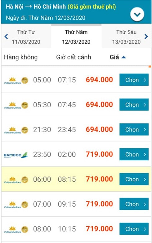 Một đại lý bán vé máy bay tại Hà Nội cho biết, giá vé chặng Hà Nội – TP.HCM đang được Vietnam Airlines ưu đãi chỉ còn 694.000 đồng cho các chuyến bay vào sáng sớm và đêm muộn. Giá vé các khung giờ khác cũng chỉ còn 719.000 đồng/vé.