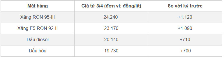 Theo đó, giá xăng E5 RON 92 tăng 1.090 đồng/lít, giá bán lên 23.170 đồng/lít. Xăng RON 95 tăng 1.120 đồng/lít, giá bán là 24.240 đồng/lít. Giá dầu diesel tăng 710 đồng/lít, giá bán không cao hơn 20.140 đồng/lít. Giá dầu hỏa tăng 700 đồng/lít, giá bán là 19.730 đồng/lít.