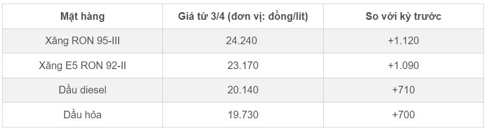 Theo đó, giá xăng E5 RON 92 bán ra 23.170 đồng/lít. Xăng RON 95 giá bán là 24.240 đồng/lít. Giá dầu diesel không cao hơn 20.140 đồng/lít. Giá dầu hỏa là 19.730 đồng/lít.