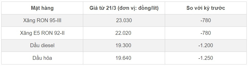 Theo đó, giá xăng E5 RON 92 giảm 780 đồng/lít, giá xuống mức 22.020 đồng/lít. Giá xăng RON 95 giảm 780 đồng/lít, giá bán là 23.030 đồng/lít. Giá dầu diesel giảm 1.200 đồng/lít, giá bán không cao hơn 19.300 đồng/lít. Giá dầu hỏa giảm 1.250 đồng/lít, giá bán là 19.640 đồng/lít.