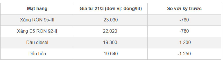Theo đó, giá xăng E5 RON 92 giảm 780 đồng/lít, giá xuống mức 22.020 đồng/lít. Giá xăng RON 95 giảm 780 đồng/lít, giá bán là 23.030 đồng/lít. Giá dầu diesel giảm 1.200 đồng/lít, giá bán không cao hơn 19.300 đồng/lít. Giá dầu hỏa giảm 1.250 đồng/lít, giá bán là 19.640 đồng/lít.