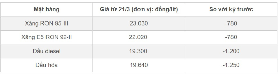 Theo đó, giá xăng E5 RON 92 giảm 780 đồng/lít, giá xuống mức 22.020 đồng/lít. Giá xăng RON 95 giảm 780 đồng/lít, giá bán là 23.030 đồng/lít. Giá dầu diesel giảm 1.200 đồng/lít, giá bán không cao hơn 19.300 đồng/lít. Giá dầu hỏa giảm 1.250 đồng/lít, giá bán là 19.640 đồng/lít.