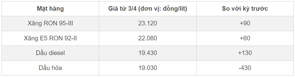 Tại thị trường trong nước, giá bán các loại xăng dầu hôm nay được áp dụng theo mức giá tại phiên điều hành ngày 3/4 của liên Bộ Tài chính - Công Thương.