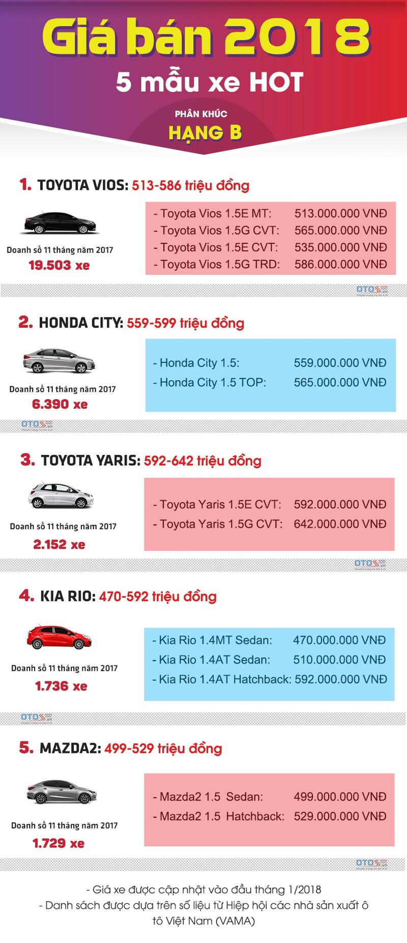 Đầu năm 2018, đa số những mẫu xe hạng B như Toyota Vios, Honda City hay Kia Rio đều sở hữu mức giá bán thấp hơn so với giá năm 2017. Đây là những mẫu xe giá trung bình được ưa chuộng nhất thị trường ô tô Việt hiện nay.
