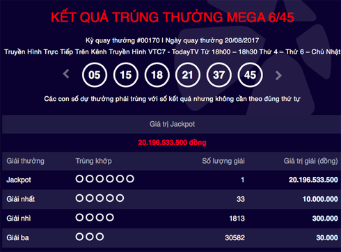 Theo đó, tại kỳ quay số mở thưởng lần thứ 170 kết thúc chiều tối ngày 20/8, Công ty xổ số điện toán Việt Nam (Vietlott) cho hay đã xác định được có 1 chiếc vé trúng giải độc đắc của loại hình xổ số điện toán tự chọn Mega 6/45.