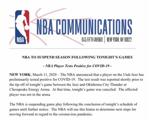 Với tình huống phát sinh bất ngờ này, NBA là giải đấu thể thao chuyên nghiệp tiếp theo bị đại dịch virus Covid-19 ảnh hưởng.