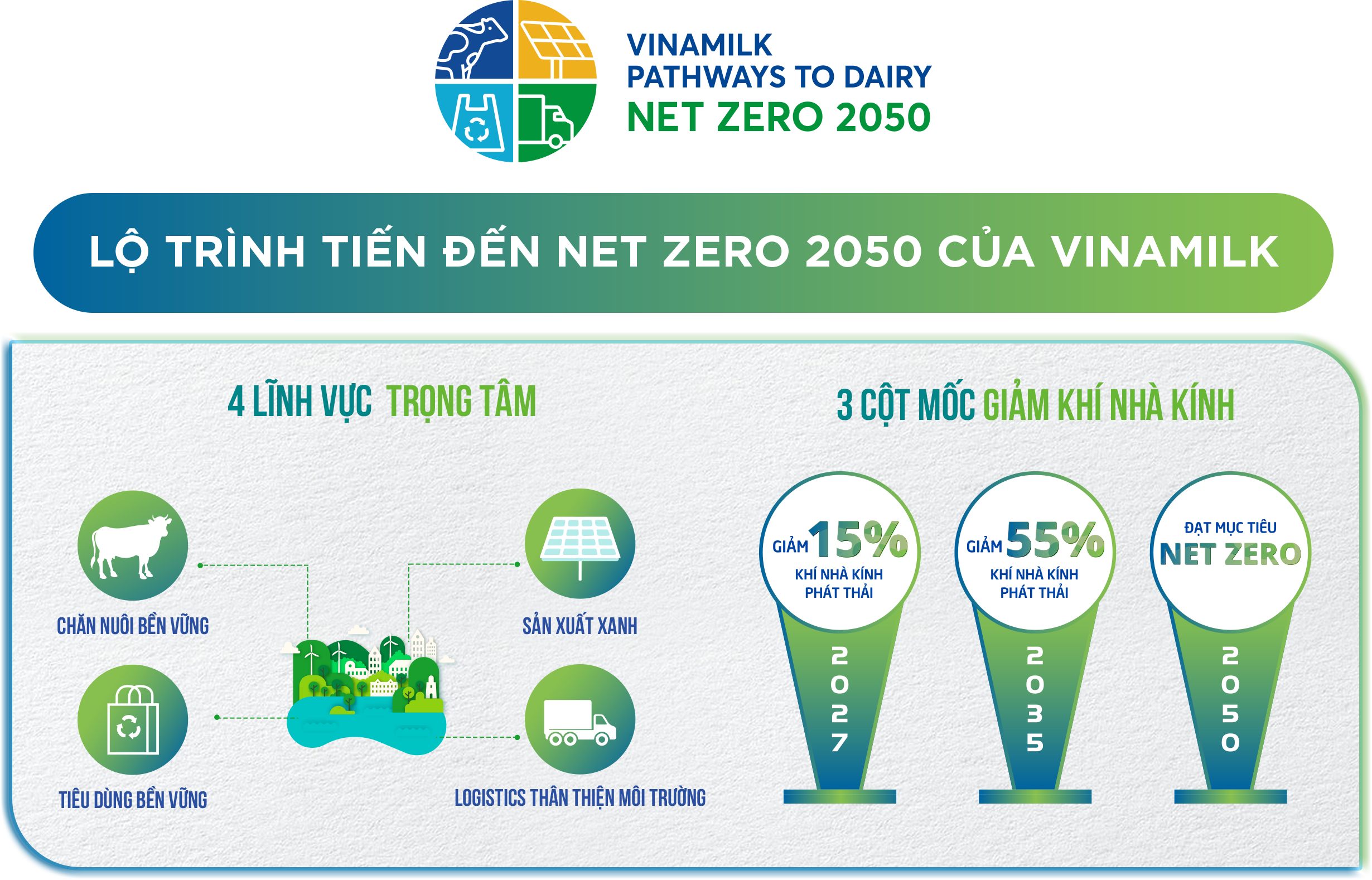 Với lộ trình cụ thể là: Giảm 15% khí nhà kính vào năm 2027, giảm 55% khí nhà kính vào năm 2035 và đạt Net Zero vào năm 2050, Vinamilk tập trung vào 4 khía cạnh Chăn nuôi bền vững – Sản xuất xanh – Logistics thân thiện với môi trường – Tiêu dùng bền vững.