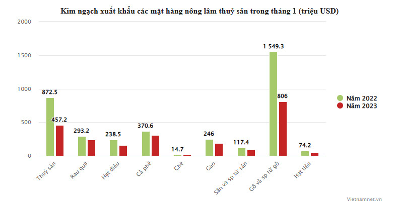 Xuất khẩu thuỷ sản đạt 457,2 triệu USD, giảm 47,3%; cà phê ước đạt 310,4 triệu USD, giảm 38,1%; rau quả đạt 242 triệu USD, giảm 16,8%; gạo đạt gần 186,6 triệu USD, giảm 24,1%; hạt điều đạt 155,8 triệu USD, giảm 33.8%.