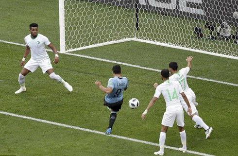 Uruguay vẫn chưa tạo được dấu ấn nào trong lối chơi tấn công khi Suarez và Cavani chưa tìm được tiếng nói chung. Ngoài ra, khả năng kết nối giữa cặp đôi này với vệ tinh xung quanh cũng chưa tốt. Có thể nhận thấy rõ sức ỳ của Suarez trong nhiều tình huống bóng, đáng lẽ anh đã có thể có những pha bứt tốc nếu ở phong độ tốt. Sau tất cả, Uruguay là người lên tiếng trước, ở phút thứ 23 sau tình huống đá phạt góc của 1 cầu thủ Uruguay, thủ môn Alowais đã băng ra đấm bóng hụt và để cho Suarez có cơ hội đệm bóng vào lưới trống.