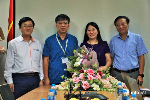 Lãnh đạo Báo (Áo kẻ xanh) tặng hoa các chuyên gia Y tế. |