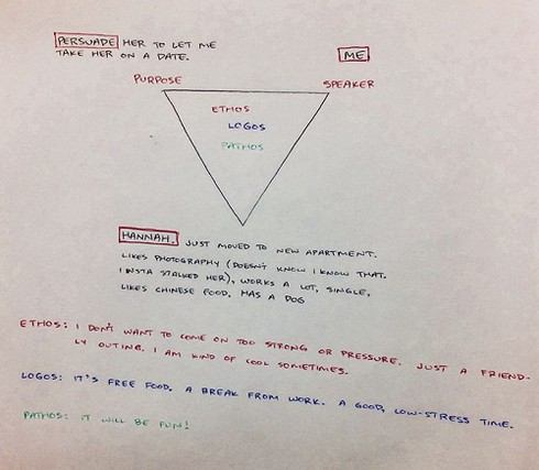 Ethos là phương tiện thiết lập độ tin cậy hoặc thể hiện cá tính của người nói. Ở đây, Jake là chàng trai thân thiện, tốt bụng, chỉ muốn giúp đỡ người khác. Pathos là sức lôi cuốn, truyền cảm cho người nghe, do đó Jake có thể nhắc đến chú chó trong đề xuất hẹn hò để gây ấn tượng tốt với bạn gái.