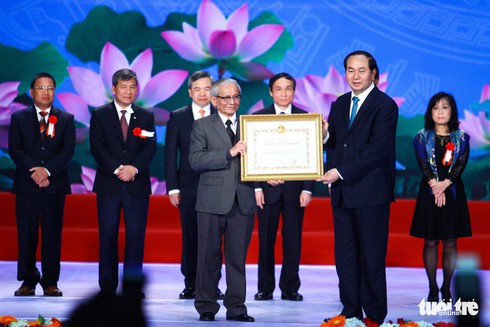 Chủ tịch nước Trần Đại Quang trao tặng Giải thưởng Hồ Chí Minh về khoa học và công nghệ cho giáo sư sử học Phan Huy Lê - Ảnh: NGUYỄN KHÁNH |