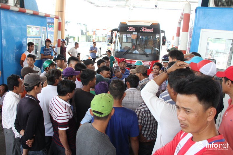Ngay sau đó, nhiều xe khách tiếp tục dừng tại các làn thu phí nhấn còi, đòi xả trạm.