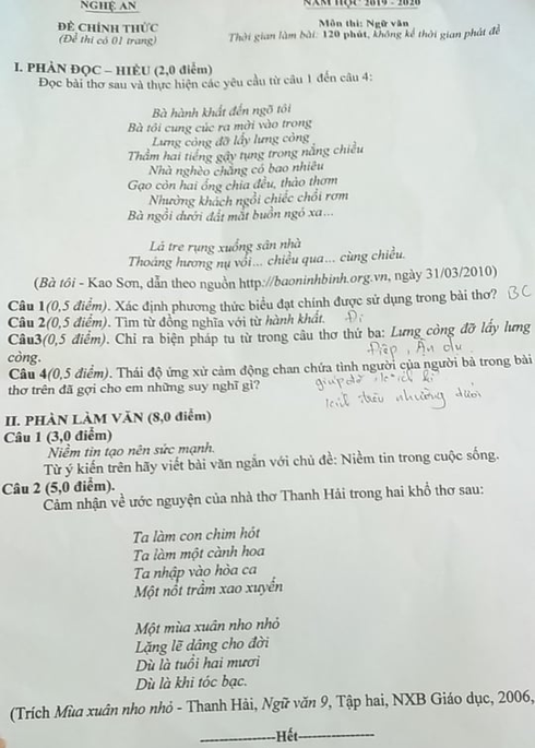 Đề thi Tuyển sinh vào lớp 10 môn Văn của Sở Giáo dục và đào tạo Nghệ An năm nay giữ cấu trúc quen thuộc với hai phần: Đọc hiểu (2 điểm) và Phần làm văn (8 điểm). Tuy nhiên, điểm khác biệt ở phần Làm văn với câu nghị luận văn học (5 điểm) không còn được lựa chọn 1 trong 2 đề giống như đề thi năm 2018 – 2019. Cụ thể như sau: