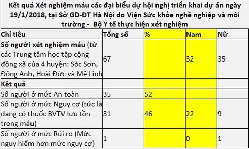 Kết quả, trong tổng số 67 người tham gia có 35 người ở mức an toàn; 31 người ở mức nguy cơ (tức là đang có thuốc BVTV lưu tồn trong máu); 1 người ở mức rủi ro (nguy hiểm hơn mức nguy cơ). Đáng nói là, hầu hết là cán bộ từ lãnh đạo xã, giám đốc, phó giám đốc các trung tâm học tập cộng đồng xã, thị trấn, nhân viên BVTV, văn hóa, giáo dục… không trực tiếp tham gia vào sản xuất trên ruộng đồng như nông dân.