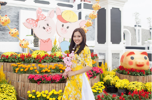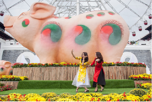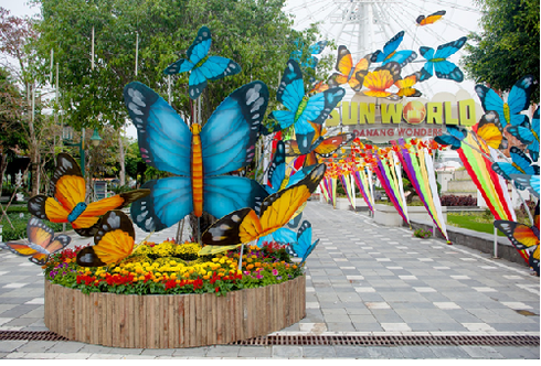 Công viên đẳng cấp Sun World Danang Wonders biến hóa thành một khu vườn ngập tràn hương sắc mùa xuân với lễ hội “Heo vàng gõ cửa” diễn ra từ ngày 5 - 14/2/2019 (tức mồng 1 đến mồng 10 Tết Kỷ Hợi). Hàng loạt đại cảnh, tiểu cảnh được trang hoàng lộng lẫy khắp công viên chủ đề lớn nhất miền Trung. Hoa hiện diện khắp nẻo với đủ sắc màu, đặc biệt là cả một đàn bướm khổng lồ rập rờn chào đón du khách chơi xuân.
