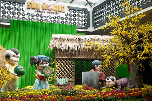 Bên cạnh không gian Tết tươi mới, rộn ràng với đủ sắc màu, lễ hội xuân tại Sun World Danang Wonders còn đem đến những gam màu đậm nét truyền thống với hình ảnh đón Tết ở làng quê bên nồi bánh chưng nghi ngút khói và những cô bé, cậu bé xúng xính áo mới.