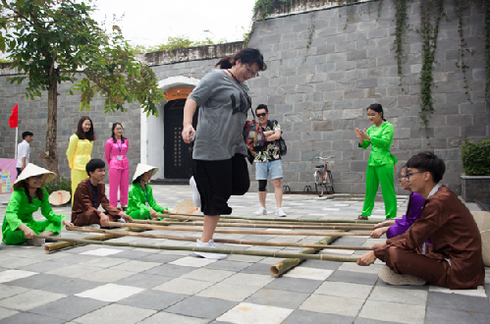 Vui bất tận là vô số trò chơi dân gian đặc sắc khiến mỗi du khách như được “một vé trở về tuổi thơ”. Trò chơi nhảy sạp không lúc nào vắng người, trong đó có rất nhiều du khách nước ngoài cũng muốn được thử sự nhanh nhạy của đôi chân với những chiếc gậy tre liên tục “múa” theo nhịp điệu.