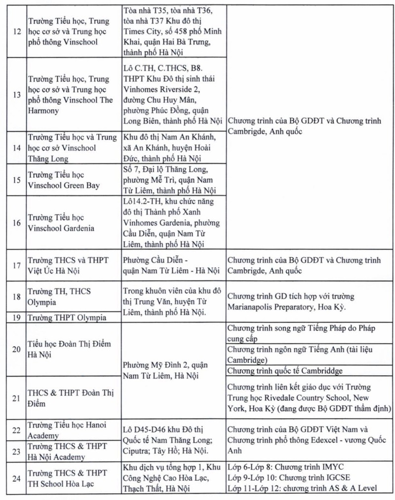 Danh sách 24 trường học có yếu tố nước ngoài ở Hà Nội. |