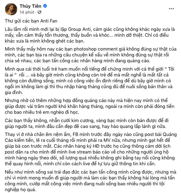 Thủy Tiên tâm sự: "Thư gửi các bạn anti-fan. Lâu lắm rồi mình mới lại bị lập group Anti, cảm giác cũng không khác ngày xưa là mấy, vẫn cảm thấy tổn thương, thấy buồn và khóc... mình dở thiệt. Chỉ có điều khác xưa là mình không ghét các bạn.