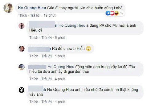 Rất nhiều fan hâm mộ đã động viên và chia buồn với anh chàng. Một điều khá bất ngờ là fan bắt gặp bình luận của Hồ Quang Hiếu dưới status của Hồ Việt Trung. "Của đi thay người..xin chia buồn cùng Trung nhé", Hiếu "Bến tàu" chia sẻ cùng đồng nghiệp.