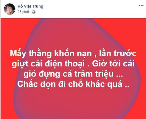 Trên trang cá nhân, Hồ Việt Trung vừa mới chia sẻ tin buồn. Nam ca sĩ bị giật túi xách đựng cả trăm triệu đồng khi đang di chuyển trên đường. "Mấy thằng khốn nạn, lần trước giựt cái điện thoại. Giờ tới cái giỏ đựng cả trăm triệu. Chắc dọn đi chỗ khác quá!", Hồ Việt Trung bức xúc viết.