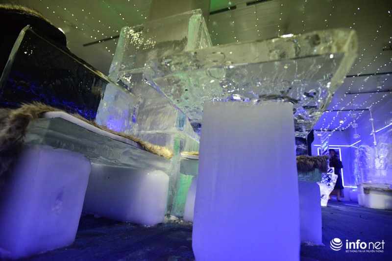 Phòng -10 độ C, toàn bộ bàn ghế làm từ băng đá. Ghế ngồi phủ lông, da cách nhiệt và chống ướt. Tổng kinh phí để thiết kế nên mô hình quán này hết khoảng 2 tỷ đồng. |