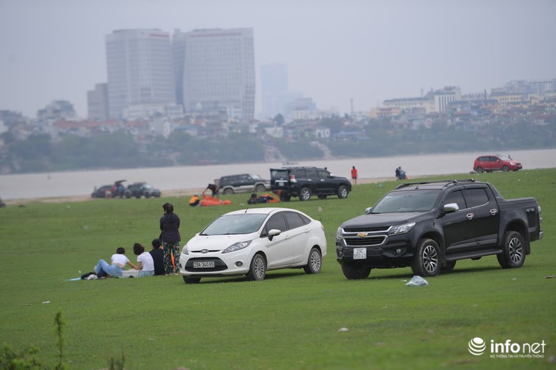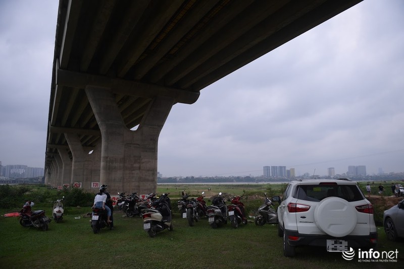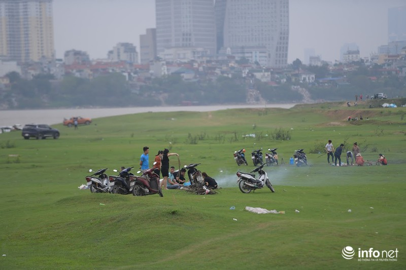 Rất đông người tụ tập ăn uống ở phía dưới chân cầu Vĩnh Tuy chiều qua (29/3). |