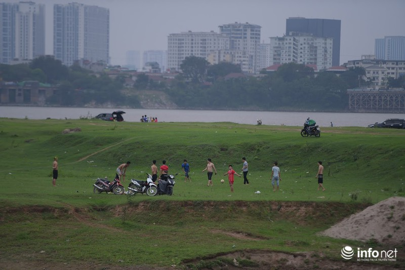 Một số thanh niên ra khu vực bãi bồi để đá bóng. |