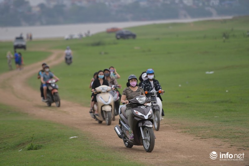 Đường đi ra bãi bồi này rất khó khăn, thế nhưng nhiều phụ nữ cũng liều lĩnh, phóng xe máy ra đây để tụ tập. |