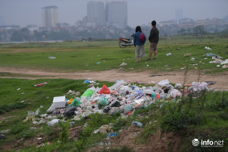 Rác thải "bủa vây" bãi bồi sau khi nhiều người ra đây tụ tập ăn uống và không dọn dẹp. |
