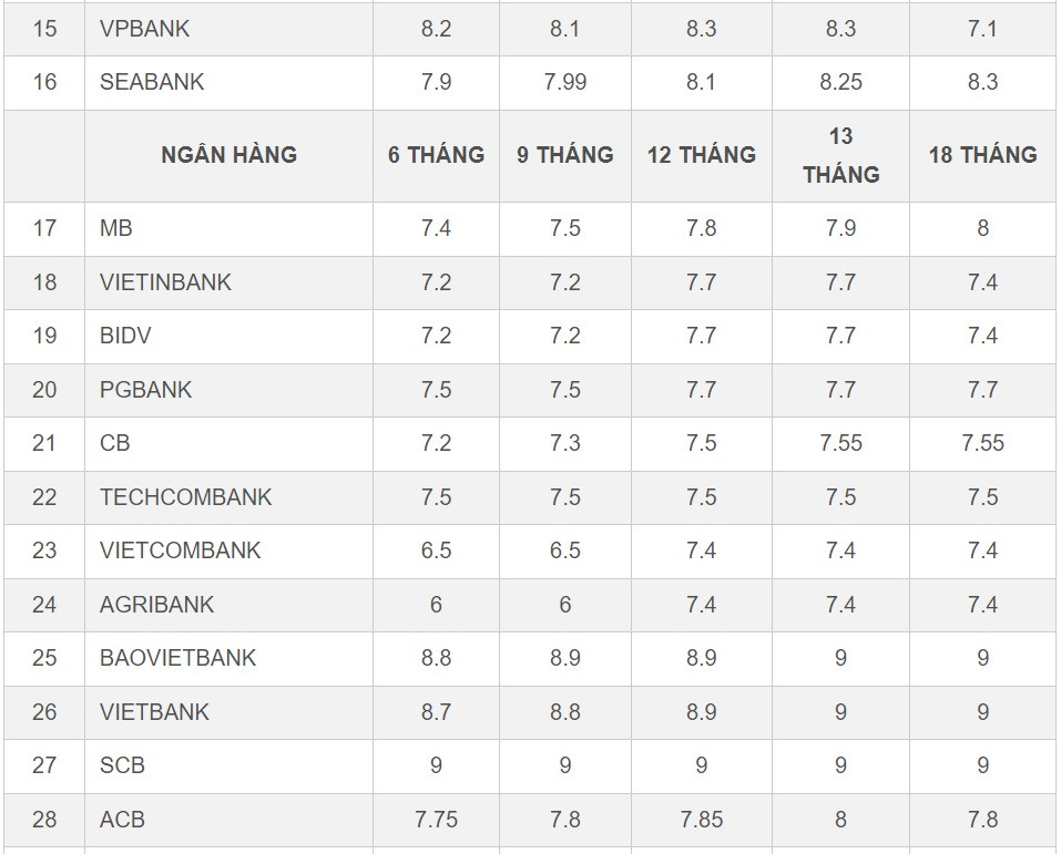 Tương tự, Ngân hàng VietBank cũng giữ nguyên mức lãi suất cũ, các kỳ hạn từ 13 tháng trở lên đều có chung lãi suất 9%/năm, thuộc nhóm dẫn đầu thị trường về lãi suất huy động cao nhất.