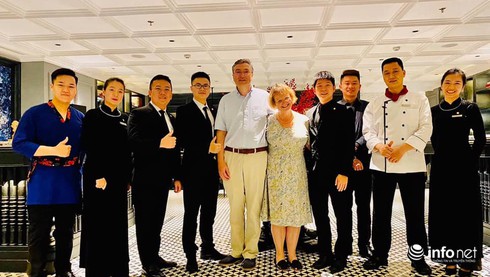 Ông Mckellar Robert John Lindsay và bà Mckellar Rachel Mary chụp ảnh lưu niệm cùng đội ngũ nhân viên khách sạn trước khi ra sân bay rời Hà Nội.