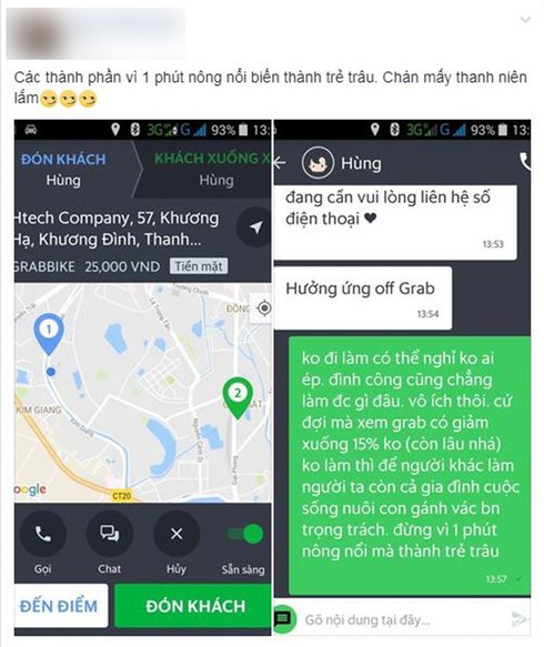 Anh Lương Tuấn Nghĩa (một tài xế Grab tại Trần Duy Hưng) cho biết: “Đầu tuần đi làm, chưa mở hàng. Gặp mấy anh em đình công. bị hủy 2 cuốc xong khỏi nổ luôn. Đứng cả tiếng rồi, ngồi lướt facebook hết 40% pin cũng ko thấy động tĩnh gì. Theo tôi thấy 20% đã là rẻ hơn so hơn với uber rồi. Chỉ riêng có cắt hỗ trợ cao điểm thôi, chạy hại xe tốn xăng gấp 2 3 lần bình thường mà giá cuốc xe vẫn vậy”.