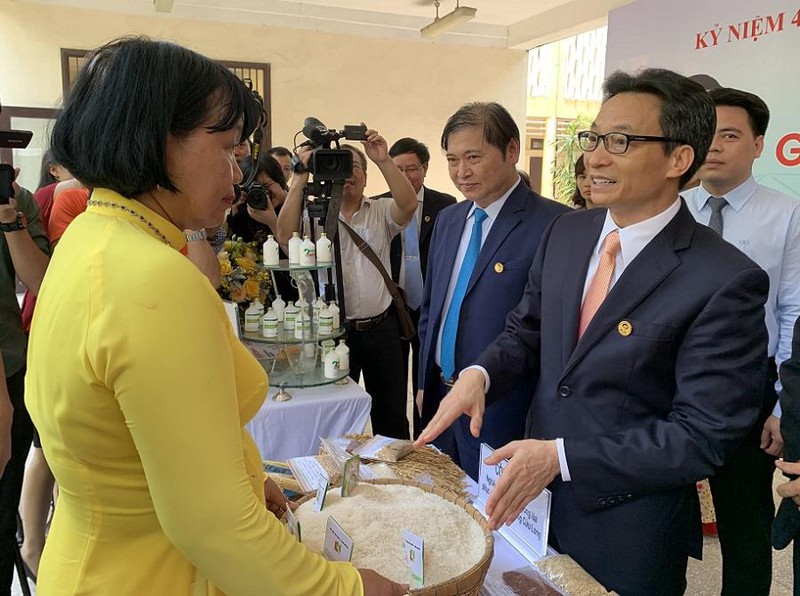 GS.TS Nguyễn Thị Lang giới thiệu với Phó Thủ tướng Vũ Đức Đam về công trình"Nghiên cứu chọn tạo giống lúa phục vụ Đồng bằng sông Cửu Long" bên lề Lễ trao tặng Giải thưởng Trần Đại Nghĩa sáng 17/5/2019. |