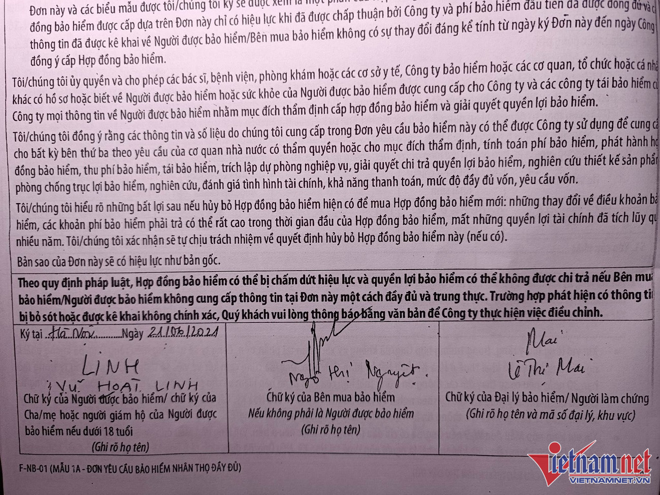 Bà Nguyệt nói, vì tin lời nhân viên SCB nên bà không đọc qua hợp đồng. Bản hợp đồng dài 25 trang giấy với rất nhiều điều khoản, nếu có đọc thì thực sự cũng là thách thức đối với một người cao tuổi. Hợp đồng bảo hiểm này thể hiện bên mua là bà Ngô Thị Nguyệt, người được bảo hiểm là ông Vũ Hoài Linh (sinh năm 1972, con trai bà Nguyệt).