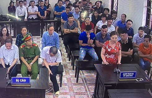 Bà Nguyễn Thị Xuân Hương (váy đỏ) tại tòa. |