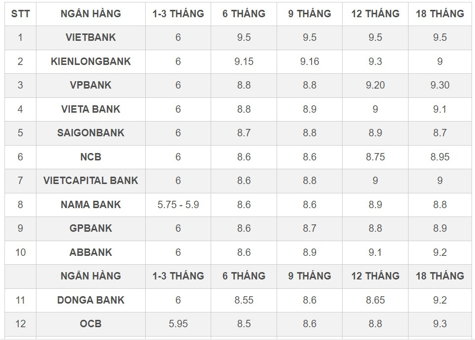 Theo thống kê của VietNamNet đối với biểu lãi suất huy động online tại các ngân hàng, VietBank đang có lãi suất cao nhất lên tới 9,5%/năm cho tiền gửi kỳ hạn từ 6 tháng trở lên.
