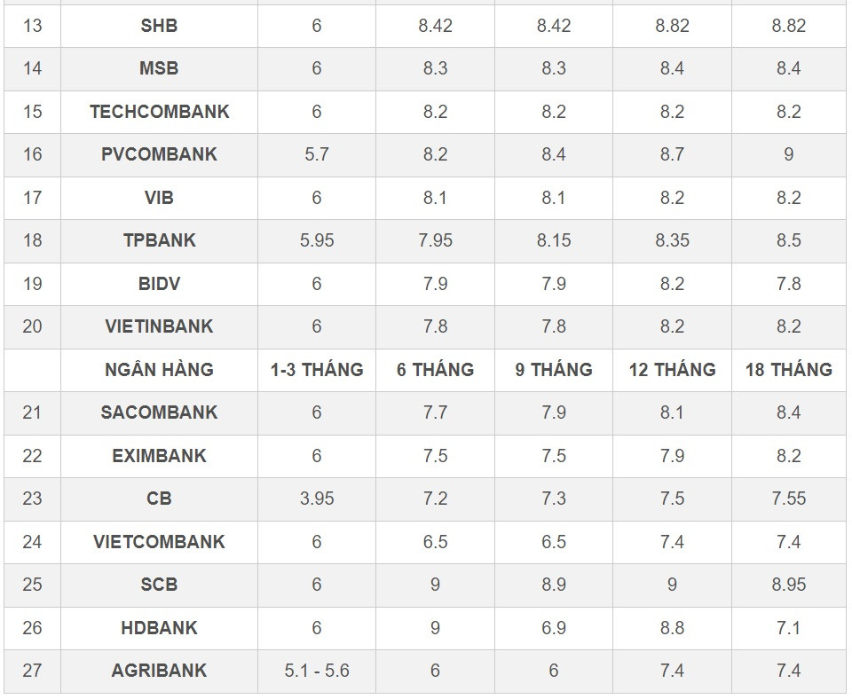 Điển hình như OCB vẫn đang áp dụng lãi suất 9,3%/năm cho các kỳ hạn tiền gửi từ 12 tháng trở lên.